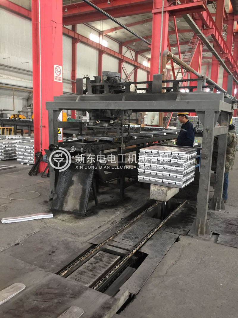 產品簡介: 用途用于生產鋁合金錠。鋁錠鑄造機主要結構說明:四輪式連鑄機由上下澆煲,重力調流裝置,結晶輪及傳動裝置,壓緊輪裝置,鋼帶涂油裝置,引橋,漲緊裝置,剔錠裝置,內外側冷卻裝置及鋼···